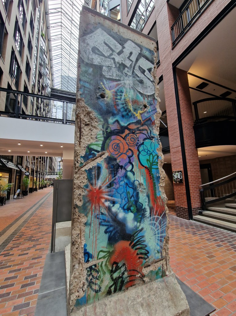 C’est loin du Canada que j’imaginais mais, lors d’une balade, nous avons la chance d’y découvrir un morceau du mur de Berlin. C’est avec émotion que je raconte à mes filles que je me souviens encore des infos du soir qui annonçaient sa chute. A la télé, je voyais des larmes et des explosions de joie. Je sentais bien que j’assistais à un moment historique. Je me souviens encore des masses qui s’abattaient dessus. Un grand moment de se retrouver devant un morceau de l’histoire !